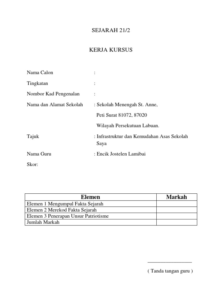 Nie contoh muka depan kerja kursus sejarahngan elemen 3 sekali. Untuk peperiksaan spm mulai tahun 2021 kementerian pendidikan malaysia mula menggunakan format baharu kssm menggantikan format lama kbsm. Nie contoh muka depan kerja kursus sejarahngan elemen 3 sekali.